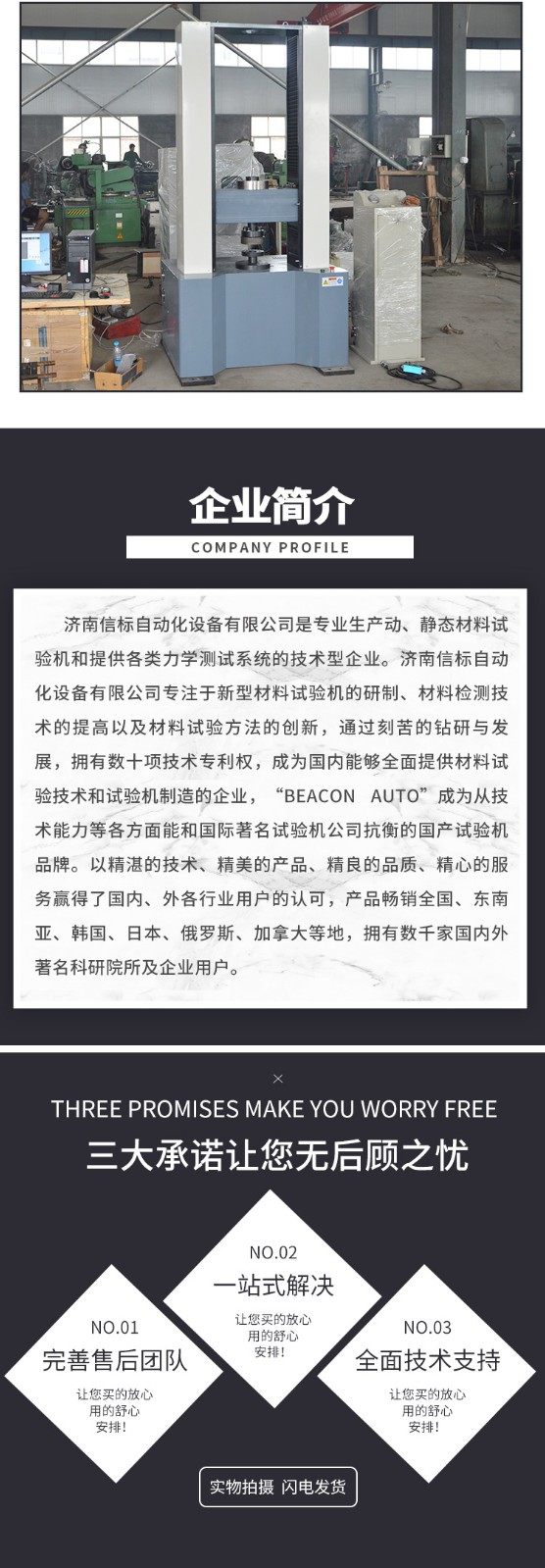 濟南信標自動化設備有限公司主要生產:動靜態萬能疲勞試驗機,接骨板彎曲試驗機,縫合線拉伸疲勞試驗機,髖膝關節磨損試驗機,電子萬能試驗機、液壓萬能試驗機、巖石三軸、四軸,電液拉力試驗機,材料試驗機,高低溫蠕變,高低頻疲勞,拉伸、扭轉、杯突等二十多個系列兩千多個的品種。