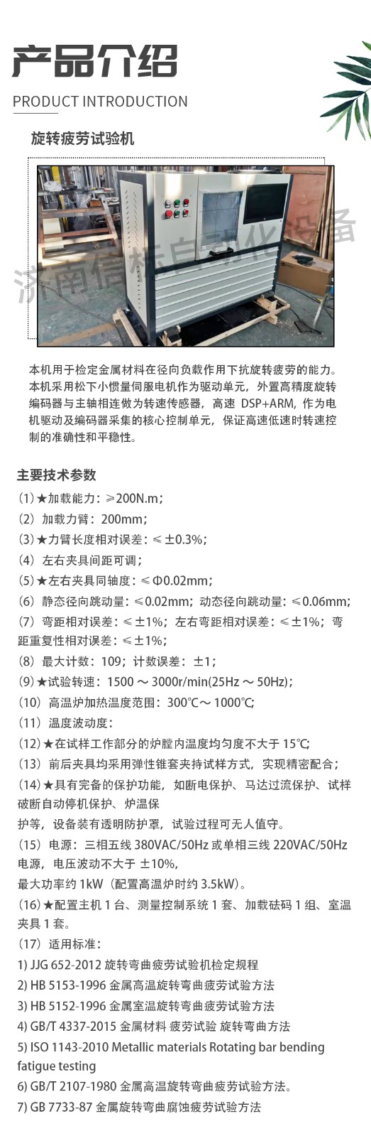 主要技術(shù)指標(biāo)(可根據(jù)客戶材料要求定制) (1)★加載能力:≥200N.m; (2)加載力臂:200mm; (3)★力臂長(zhǎng)度相對(duì)誤差:≤±0.3%; (4)左右夾具間距可調(diào); (5)★左右夾具同軸度:≤Ф0.02mm; (6)靜態(tài)徑向跳動(dòng)量:≤0.02mm;動(dòng)態(tài)徑向跳動(dòng)量:≤0.06mm; (7)彎距相對(duì)誤差:≤±1%;左右彎距相對(duì)誤差:≤±1%;彎距重復(fù)性相對(duì)誤差:≤±1%; (8)最大計(jì)數(shù):109;計(jì)數(shù)誤差:±1; (9)★試驗(yàn)轉(zhuǎn)速:1500~3000r/min(25Hz~50Hz); (10)高溫爐加熱溫度范圍:300℃~1000℃; (11)溫度波動(dòng)度: (12)★在試樣工作部分的爐膛內(nèi)溫度均勻度不大于 15℃; (13)前后夾具均采用彈性錐套夾持試樣方式,實(shí)現(xiàn)精密配合; (14)★具有完備的保護(hù)功能,如斷電保護(hù)、馬達(dá)過(guò)流保護(hù)、試樣破斷自動(dòng)停機(jī)保護(hù)、爐溫保 護(hù)等,設(shè)備裝有透明防護(hù)罩,試驗(yàn)過(guò)程可無(wú)人值守。 (15)電源:三相五線 380VAC/50Hz 或單相三線 220VAC/50Hz 電源,電壓波動(dòng)不大于±10%, 最大功率約 1kW(配置高溫爐時(shí)約 3.5kW)。 (16)★配置主機(jī) 1 臺(tái)、測(cè)量控制系統(tǒng) 1 套、加載砝碼 1 組、室溫夾具 1 套。 (17)適用標(biāo)準(zhǔn): 1)JJG 652-2012 旋轉(zhuǎn)彎曲疲勞試驗(yàn)機(jī)檢定規(guī)程 2)HB 5153-1996 金屬高溫旋轉(zhuǎn)彎曲疲勞試驗(yàn)方法 3)HB 5152-1996 金屬室溫旋轉(zhuǎn)彎曲疲勞試驗(yàn)方法 4)GB/T 4337-2015 金屬材料 疲勞試驗(yàn) 旋轉(zhuǎn)彎曲方法 5)ISO 1143-2010 Metallic materials Rotating bar bending fatigue testing 6)GB/T 2107-1980 金屬高溫旋轉(zhuǎn)彎曲疲勞試驗(yàn)方法。 7)GB 7733-87 金屬旋轉(zhuǎn)彎曲腐蝕疲勞試驗(yàn)方法