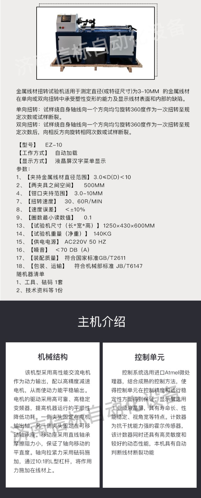 金屬線材扭轉(zhuǎn)試驗機適用標準: 金屬線材扭轉(zhuǎn)試驗機適用于中華人民共和國標準GB/T 239.1-2012《金屬材料 線材 第一部分 單向扭轉(zhuǎn)試驗方法》、GB/T 239.2-2012《金屬材料 線材 第二部分 雙向扭轉(zhuǎn)試驗方法》,也適用于國際標準ISO 7800:2003《金屬線材單向扭轉(zhuǎn)試驗方法》和ISO 9649:1990《金屬線材雙向扭轉(zhuǎn)試驗方法》。 金屬線材扭轉(zhuǎn)試驗機應(yīng)用領(lǐng)域: 該機主要用于大專院校、科研部門、工礦企業(yè)的力學(xué)實驗室的金屬線材的力學(xué)性能分析,也廣泛用于生產(chǎn)單位的在線檢測;主要行業(yè)有鋼廠高速線、預(yù)應(yīng)力鋼絲廠、質(zhì)量監(jiān)督、科研院所、公路交通、建筑行業(yè)、鋼絲繩、電線電纜、電氣化鐵道用銅及銅合金導(dǎo)線、銅接觸線等生產(chǎn)和使用部門。 金屬線材扭轉(zhuǎn)試驗機主機介紹: 1、機械結(jié)構(gòu): 該機型采用高性能交流電機作為動力輸出,配以高精度減速電機,從而使動力能平穩(wěn)輸出。電機的驅(qū)動采用高可靠、高穩(wěn)定變頻器,提高機器運行的平順性,降低功耗。一側(cè)夾頭固定在電機輸出軸,另一側(cè)夾頭固定在可移動軸承座。移動座采用直線軸承,摩擦阻力小,保證了軸向移動的平直度。軸向拉緊力采用砝碼施加,通過10:1的L型杠桿,將作用力施加在線材上。 2、控制單元: 控制系統(tǒng)選用進口Atmel微處理器,結(jié)合成熟的控制方法,使得控制單元在控制精度和運行穩(wěn)定性方面得到保證。