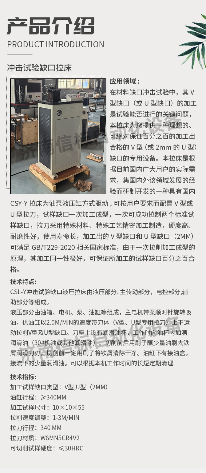 CSY-Y拉床為油泵液壓缸方式驅動,可按用戶要求而配置V 型或U 型拉刀,試樣缺口一次加工成型,一次可成功拉制兩個標準試樣缺口,拉刀采用特殊材料、特殊工藝精密加工制造,硬度高、耐磨性好,使用壽命長,加工出的V 型缺口和U 型缺口(2mm)可滿足GB/T229-2020相關國家標準,由于一次拉削加工成型的原理,其加工同一性極好,可保證所加工的試樣缺口百分之百合格。 三、技術特點: CSL-Y沖擊試驗缺口液壓拉床由液壓部分, 主傳動部分,電控部分,輔助部分等組成。 液壓部分由油箱、電機、泵、油缸等組成,主電機帶泵順時針旋轉吸油,供油缸以2.0m/min的速度帶刀體(V型、U型專用拉刀)上下運動拉削V型及U型缺口。刀座上設有潤滑油杯,工作時向油杯內加滿潤滑油(30#機油或其他潤滑油)。切削前后用刷子蘸少量油刷去鐵屑潤滑刀刃,切削前一定用刷子將鐵屑清除干凈。油缸下有接油盒,接流下的少量潤滑油。可以根據本機工作時間的長短定期清理 四、技術指標: 加工試樣缺口類型:V型,U型(2mm) 油缸行程:≥340mm 加工試樣尺寸:10×10×55 拉削速度調整:1-3m/min 拉刀行程:340 mm 拉刀材質:W6Mn5Cr4V2 可切削試樣硬度:≤30HRC 五、設備配置: 缺口自動拉床主機 1臺 拉刀及導向裝置 1套 試樣固定裝置 2套 油缸及連接部件 1套 潤滑噴淋系統 1套 10MPa油源動力系統 1套 電氣及控制系統 1套 防護系統(帶開門斷電) 1套 產品合格證 1套 產品使用說明書 1套 產品使用說明書 1套 液壓系統配件 1套