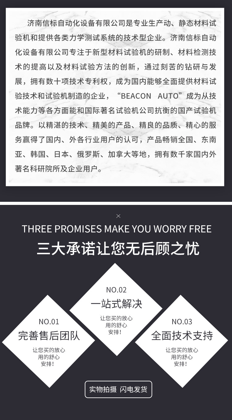 濟南信標自動化設備有限公司主要生產:動靜態(tài)萬能疲勞試驗機,接骨板彎曲試驗機,縫合線拉伸疲勞試驗機,髖膝關節(jié)磨損試驗機,電子萬能試驗機、液壓萬能試驗機、巖石三軸、四軸,電液拉力試驗機,材料試驗機,高低溫蠕變,高低頻疲勞,拉伸、扭轉、杯突等二十多個系列兩千多個的品種。