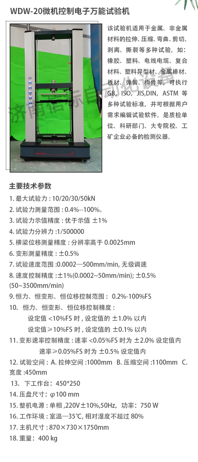 測量參數: 1. 最大試驗力: 10/20/30/50kN 2. 試驗力測量范圍: 0.4%--100%。 3. 試驗力示值精度:優于示值±1% 4. 試驗力分辨力:1/500000 5. 橫梁位移測量精度:分辨率高于0.0025mm 6. 變形測量精度: ±0.5% 7. 試驗速度范圍:0.0002—500mm/min,無級調速 8. 速度控制精度:±1%(0.0002~50mm/min); ±0.5%(50~3500mm/min) 9. 恒力、恒變形、恒位移控制范圍: 0.2%-100%FS 10.恒力、恒變形、恒位移控制精度: 設定值<10%FS時,設定值的±1.0%以內 設定值≥10%FS時,設定值的±0.1%以內 11. 變形速率控制精度: 速率<0.05%FS時為±2.0%設定值內 速率≥0.05%FS時為±0.5%設定值內 12. 試驗空間: A.拉伸空間:1000mm B.壓縮空間:1100mm C.寬度:450mm 13.下工作臺:450*250 14. 壓盤尺寸:φ100 mm 15. 整機電源:單相,220V±10%,50Hz,功率:750 W 16. 工作環境:室溫—35℃,相對濕度不超過80% 17. 主機尺寸: 870×730×1750mm 18. 重量:400 kg 產品配置: 1、主機 一套 2、松下A7全數字伺服電機及伺服驅動器; 一套 3、高精度負荷傳感器; 5kn/1kn/500N/200/ 各一支 4、Hiwin精密滾珠絲杠; 2支 5、光電編碼器(2500線,內置); 1支 6、夾具:滿足海綿/汽車座椅所需工裝 1套(有多種) 7、三閉環測量系統一套,采用力,位移,應變等多種控制方式,試驗過程中可實時顯示力-位移,力-時間,應力-應變等多種試驗曲線,并可自動得出最大負荷,拉伸強度,斷裂伸長率等多種 結果參數。 8、HP品牌計算機,21寸液晶顯示器; 9、打印機:HPA4彩色噴墨打印機; 10、專用試驗軟件:可執行GB,ISO,JIS、DIN,ASTM等多種試驗標準,全開放式,功能強大,方便操作,免費提供升級軟件,并可根據用戶需求自行編輯試驗軟件。