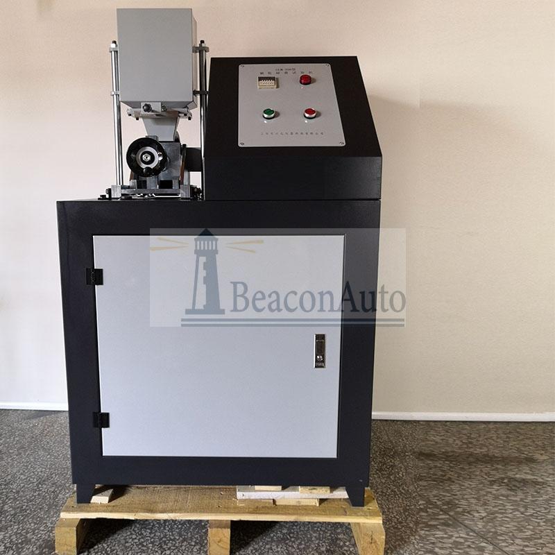 三、濕砂半自由磨料磨損試驗(yàn)機(jī)試驗(yàn)機(jī)的結(jié)構(gòu): 它由傳動系統(tǒng)、試樣夾具部分、夾具調(diào)整裝置、測硬度裝置、轉(zhuǎn)數(shù)控制系統(tǒng),電氣部分及底座、泥漿槽等組成。 1.傳動系統(tǒng): 電動機(jī)帶動軸端的皮帶輪1,通過兩根三角皮帶使皮帶輪2轉(zhuǎn)動,帶動I軸轉(zhuǎn)動,又借助I軸上小齒輪與Ⅱ軸上大齒輪的嚙合,得到第二次降速,帶動Ⅱ軸轉(zhuǎn)動。Ⅲ軸由彈性聯(lián)軸節(jié)與裝在軸承座內(nèi)的Ⅲ軸聯(lián)接,使橡膠輪轉(zhuǎn)動。 本機(jī)使用變頻調(diào)速,調(diào)整變頻器旋鈕看,轉(zhuǎn)速連續(xù)可調(diào)。 2.試樣夾具部分及夾具調(diào)整裝置: 試樣置于夾具桿的試樣槽內(nèi),上好夾緊板擰緊夾緊螺釘,則試樣表面正中對準(zhǔn)橡膠輪輪緣。夾具桿上端與一橫桿連接,橫桿通過支板與砝碼吊桿連接,使用配套標(biāo)準(zhǔn)砝碼組,對試樣進(jìn)行不同等級的加載。 夾具調(diào)整裝置,當(dāng)更換新橡膠輪時,橡膠輪裝于轉(zhuǎn)軸上,試樣槽內(nèi)裝好標(biāo)準(zhǔn)尺寸的新試樣,然后將加載橫桿放下,使試樣壓緊橡膠輪。此時加載砝碼應(yīng)為70牛(2.50千克重)。調(diào)整夾具上方的手輪,調(diào)整夾具支點(diǎn),使加載橫桿達(dá)到水平(允差為0.10/100毫米)。可用百分表以試驗(yàn)機(jī)臺面為基準(zhǔn)測量。當(dāng)橡膠輪直徑小于Ф176.5毫米,必須在磨床上,在加冷卻液的條件下修磨,修磨后按同法調(diào)整夾具支點(diǎn),方可繼續(xù)試驗(yàn)。調(diào)整支點(diǎn)為的是保證載荷通過橡膠輪中心,避免引起振動,影響試驗(yàn)結(jié)果。 砝碼編號 | 參考理論重量(千克) | 施加正壓力(牛頓) | 1 | 1.045 | 40 | 2 | 2.50 | 70 | 3 | 4.00 | 100 | 4 | 7.00 | 170 | 5 | 9.7 | 225 |